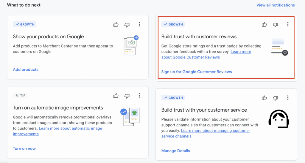 2. Scroll down below your performance and you’ll see a “Growth” box > “Sign up for Google Customer Reviews”